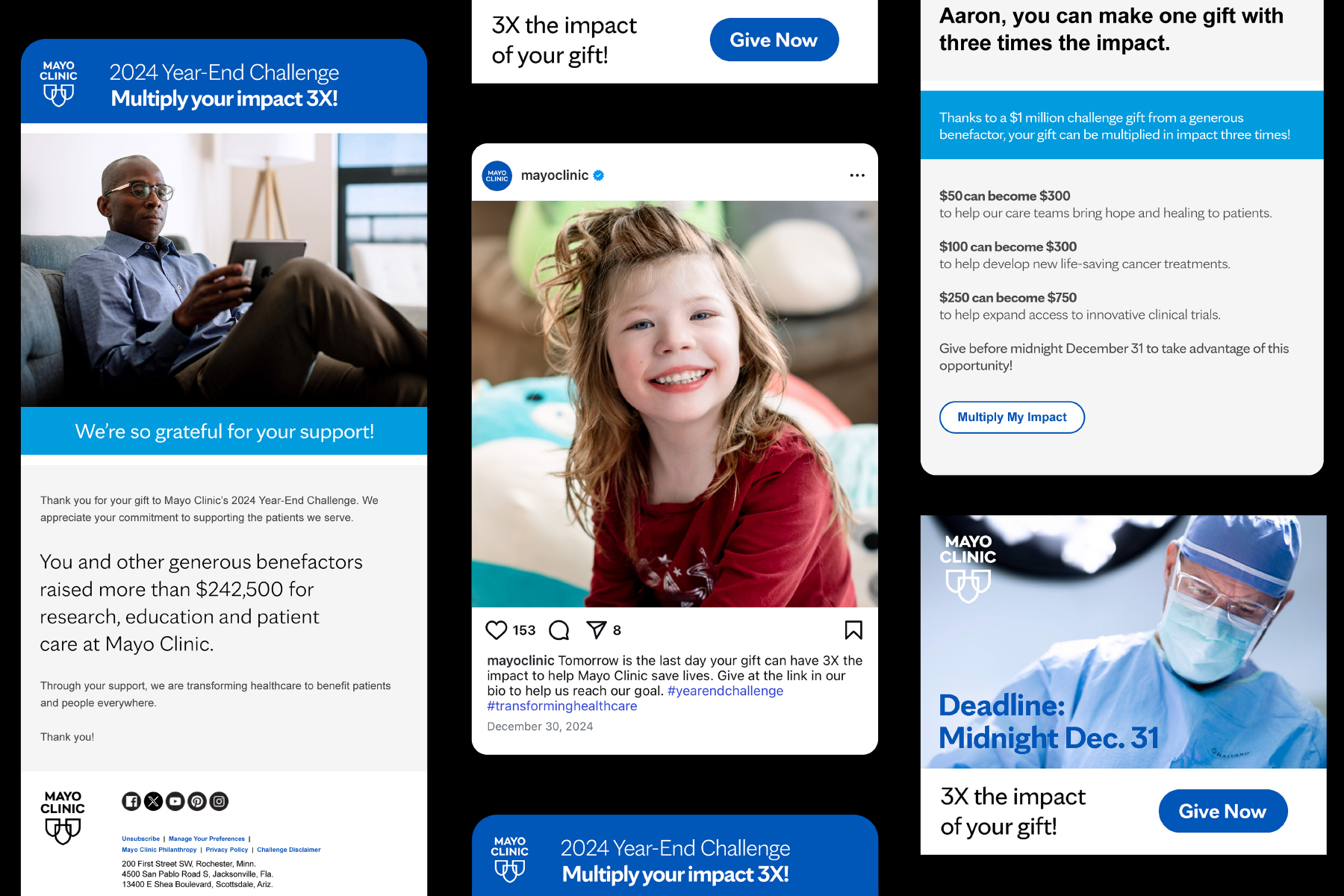 The goal was to drive year-end donations by clearly communicating the impact of a limited-time 3X match across multiple touchpoints.